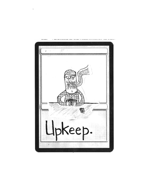 Upkeep is a biannual zine about Magic: the Gathering and the Cube format and also some other stuff. Print copies of any issue are available by sending an email to Alex or you are encouraged to print your own using the provided PDF copies. Print and digital copies are free to anyone and everyone. Donating to Trans Lifeline or the Palestine Children's Relief Fundis politely encouraged.